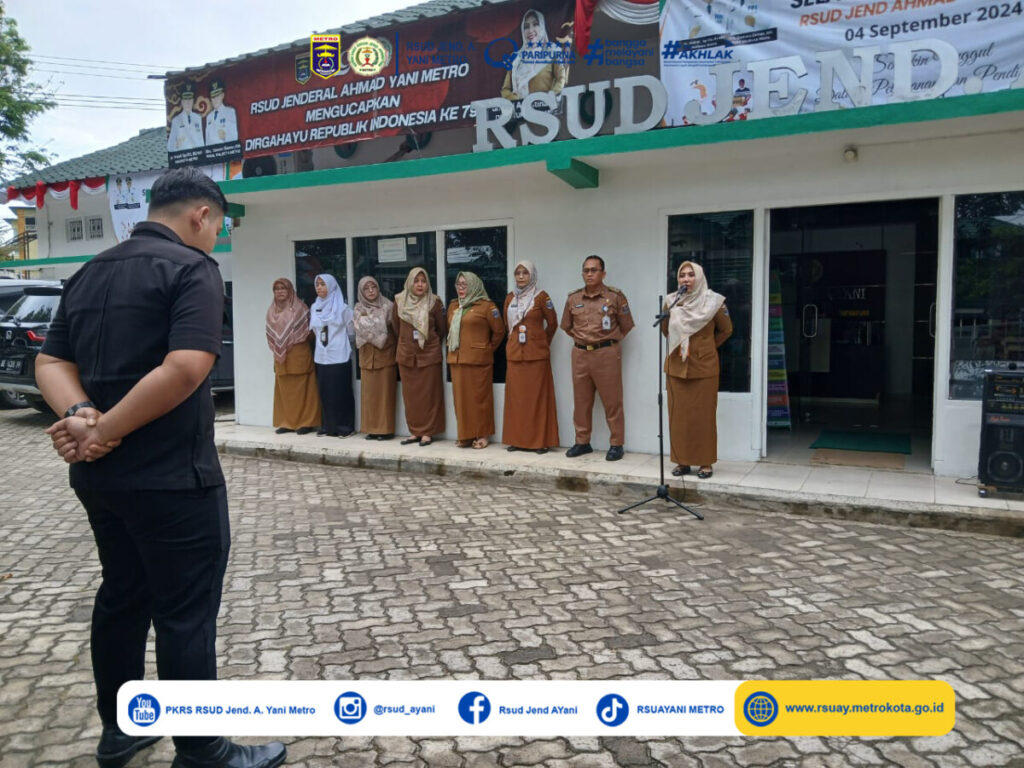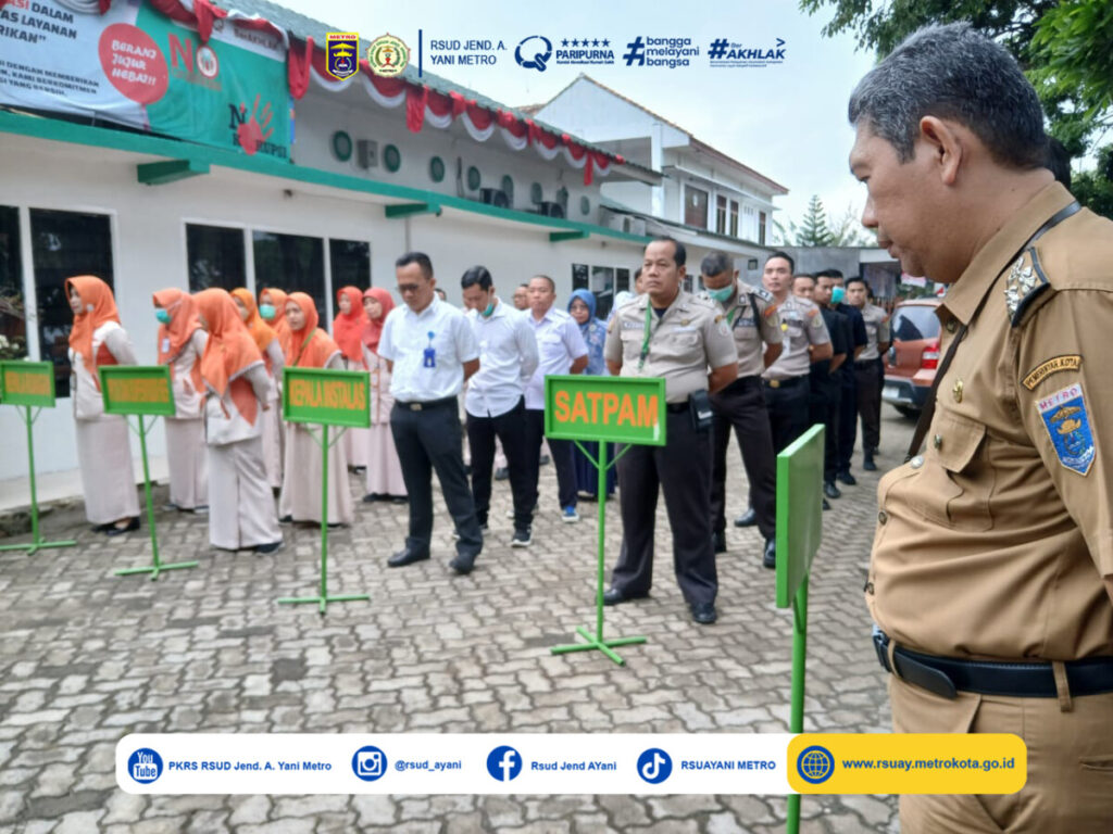 Apel pagi pada hari ini dihadiri oleh Wakil Direktur Renkeutu, Para Kabag, Para Kabid, Katim, Kepala Instalasi, Kepala Ruangan, dan seluruh pegawai RSUD Jend. A, Yani Metro.