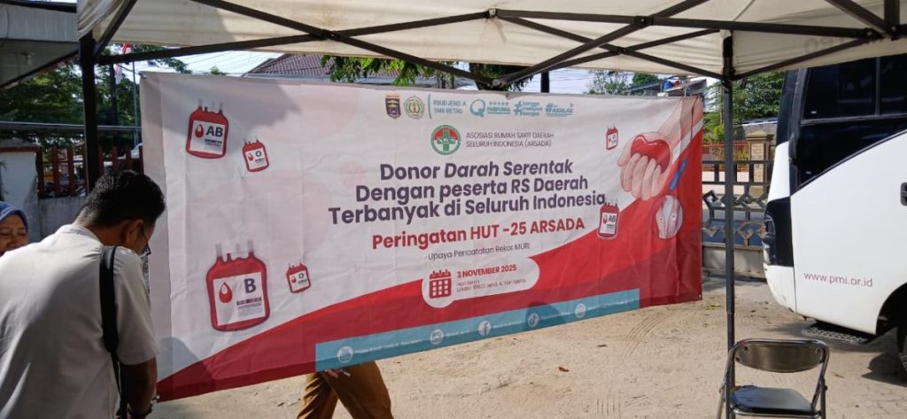 Dalam rangka HUT ke 25 Asosiasi Rumah Sakit Daerah Seluruh Indonesia (ARSADA) yang dilaksanakan di RSUD Jend. Ahmad Yani Metro. Kegiatan ini dilaksanakan pada hari Senin, 03 November 2025 di halaman kantor RSUD Jend. Ahmad Yani Metro pukul 08.00 s.d selesai. Kegiatan ini diikuti oleh pegawai RSUD Jend. Ahmad Yani Metro dari berbagai profesi, dengan jumlah calon pendonor sebanyak 46 orang yang diantaranya 13 orang tidak memenuhi kriteria pendonor dan 33 orang lainnya memenuhi kriteria pendonor sehingga bisa menyumbangkan darahnya.