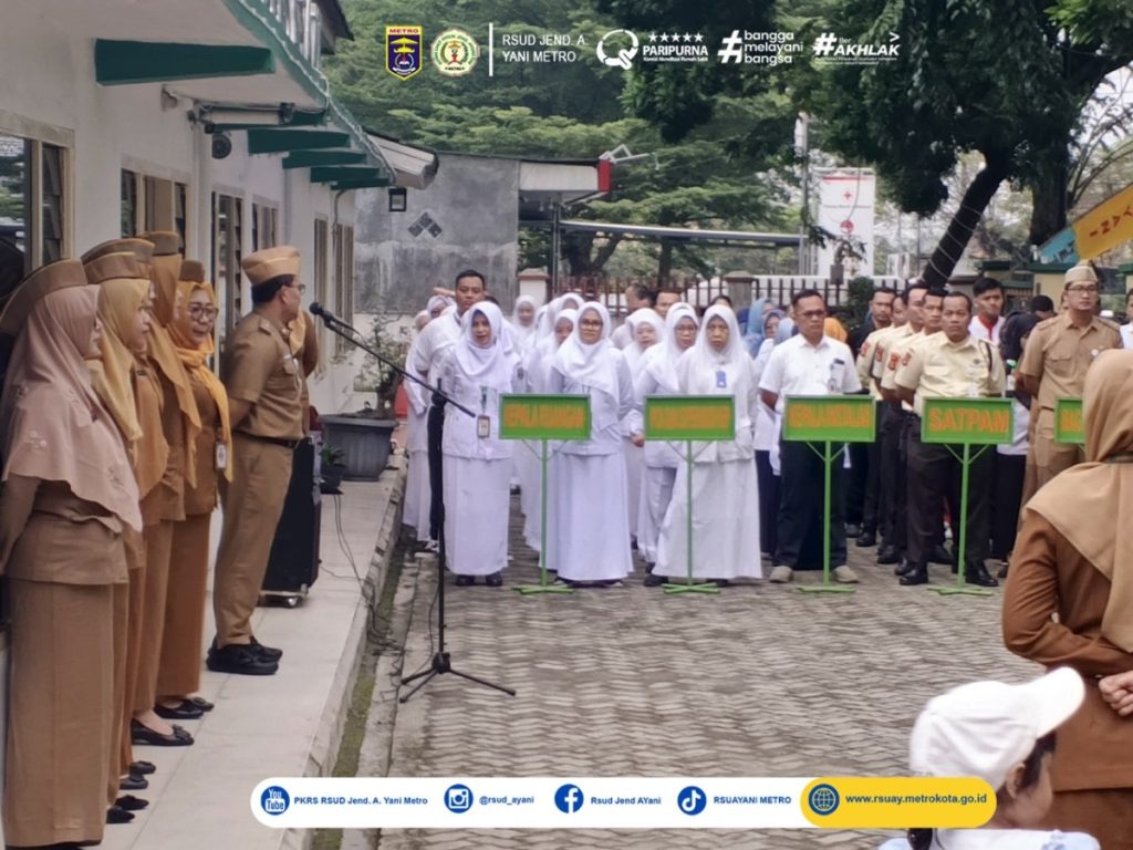 Hadir pada apel pagi ini Kepala Bagian, Kepala Bidang, Ketua Tim Kerja Manajemen, Kepala Ruangan, Kepala Instalasi, Satpam, dan Staff RSUD Jenderal Ahmad Yani Metro.Dalam amanatnya Bapak Hendarto, S.K.M.,M.Kes., pagi ini pertama-tama memberikan Apresiasi kepada seluruh peserta apel yang hadir. Meskipun dalam cuaca yang kurang bersahabat tetap semangat dalam mengikuti apel. Selanjutnya disampaikan beberapa hal diantaranya terkait Implementasi Rekam Medis Elektronik. Perlu diketahui bahwa, sesuai dengan rencana bahwa Implementasi Rekam Medis Elektronik yang semula akan dilaksanakan tanggal 1 Juli 2025, belum bisa dilakukan. Ini terjadi karena adanya kendala dalam Proses Migrasi Data Pasien, atau pemindahan data pasien yang sudah terdaftar di RSUD Jenderal Ahmad Yani ke Aplikasi yang baru. Dengan jumlah data pasien kurang lebih ada 420.000 data, ini membutuhkan waktu yang lama. Data pasien tersebut harus sudah ada di Aplikasi yang baru pada saat Implementasi Rekam Medis Elektronik agar kita tidak perlu mengulangi prosesnya dari awal lagi.